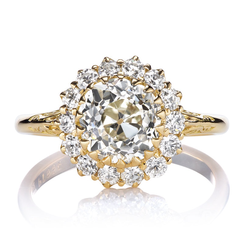 A stunning antique-inspired cluster that exudes vintage romance. Featuring a super chunky Old Mine Cut diamond with charming faceting and a soft, high crown. Surrounded by a sparkling halo and delicate engravings along the shoulder, this ring offers both gorgeous finger coverage and ample shimmer.