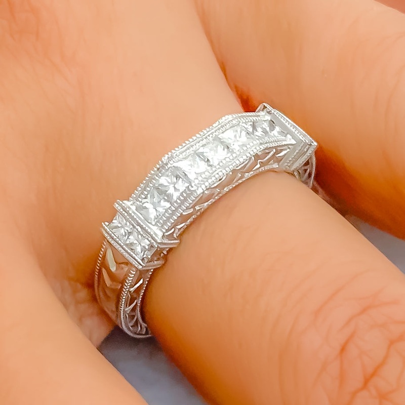 This elegant 18k white gold ring, weighing 5.1 grams, features a ritzy design centered around a 0.69-carat princess-cut diamond in F-G color and VS quality. The white gold finish enhances the diamonds clarity and sparkle, creating a refined look thats perfect for upscale events or adding sophistication to daily wear. Sized at 7 with no resizing options, this ring is ideal for those who appreciate a luxurious, modern style. Its a distinguished addition to any jewelry collection, embodying both elegance and glamour.