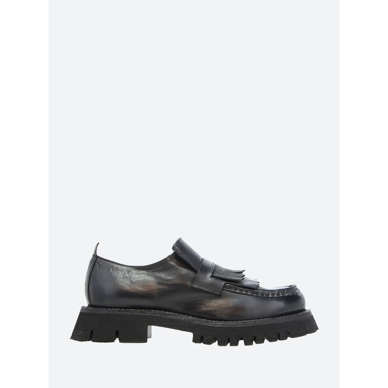 gravitypope Robella loafer has a classic style with a streamlined upper and minimal detailing. A double fringe decoration at the vamp gives it a modern look. Sits on a chunky lugged sole.