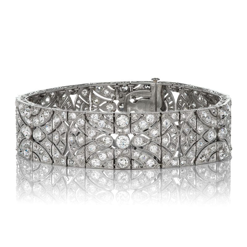 The Rochelle bracelet is an authentic diamond bracelet from theEdwardianEra circa 1915.The bracelet featuresover 250 smallold cut diamonds of approximately H-I color, VS1-SI1 clarity set in platinum that combine for over 12 carats of diamonds. The inner circumference of the band is 7.25″.