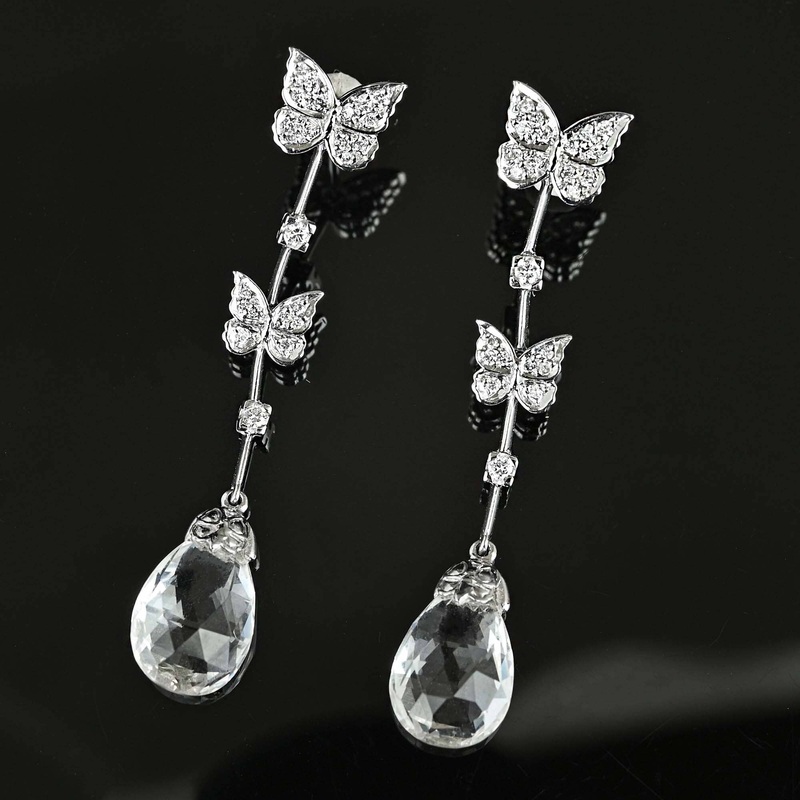 Elegant 18K white gold chandelier earrings featuring butterfly motifs adorned with diamonds and briolette faceted rock crystal teardrops. The dangling earrings showcase a diamond-studded illusion butterfly connected to an articulated bar with a second butt