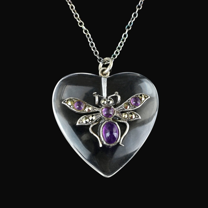Stunning silver Art Deco necklace featuring a glimmering rock crystal quartz heart pendant adorned with a charming amethyst and marcasite bug. The bug's wings and body are made of amethyst and marcasite gemstones, all delicately set in sterling silver. Thi
