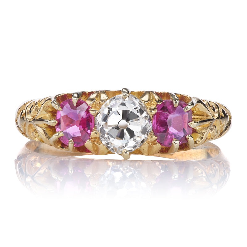 Good things come in threes, and the Roman ring certainly follows that rule! We love finding antique half hoops like these. The dark pink of the rubies contrasts perfectly with the bright white old mine-cut stone to create such a unique and vibrant piece.