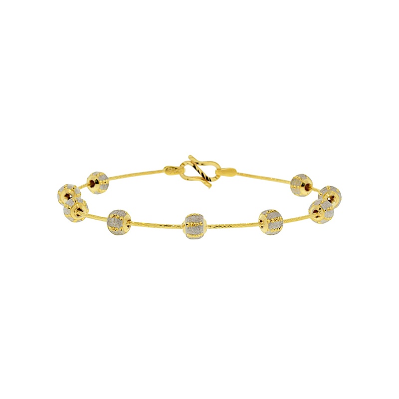DescriptionBeautiful 22k two-tone bangle bracelet with rope-style bands with white and yellow gold ball cluster at the face. DetailsFinishTwo-tone GoldMetal Purity22kWeight (grams)21.50AvailabilityIn Store Pickup: YESShipping DetailsOrders are usually fulf