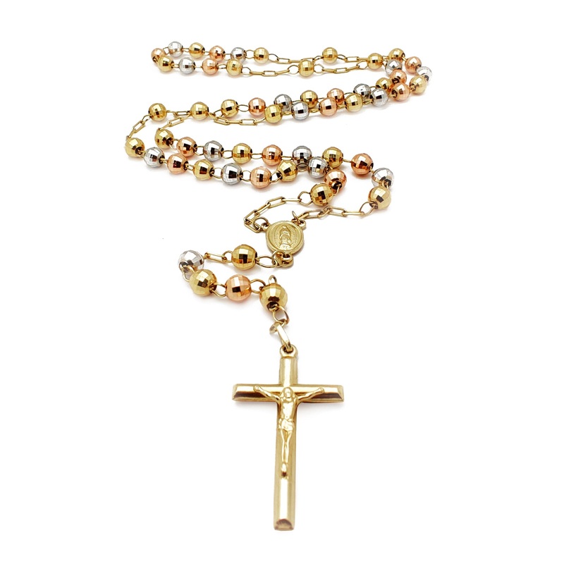 Precious Metal:14 Karat Tri-Tone GoldSmall :Beads Thickness: 2.90mm*Crucifix Height: 30.95mm*Crucifix Width: 17.15mm*Length Available:26 inches*Overhang: 3.5 Inches*Weight: 8grams*Medium:Beads Thickness:5.9 mm*Crucifix Height: 34.75 mm*Crucifix Width:20.0