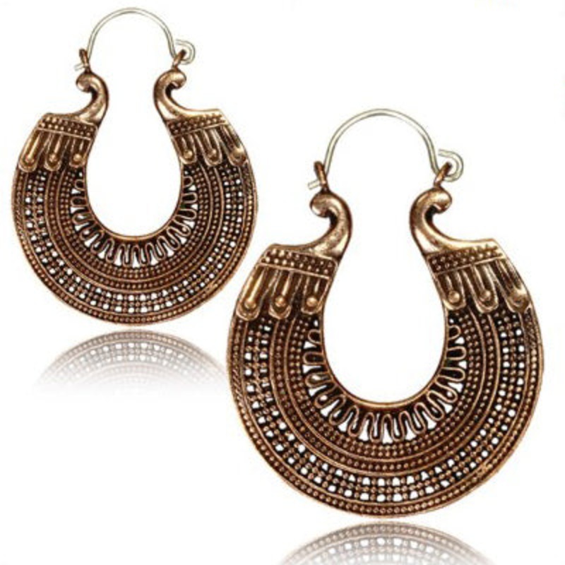 These20 gaugeboho earrings are cast from solid rose brass and approximately41mm tall x34mm wide. The wearable wire is made from sterling silver.