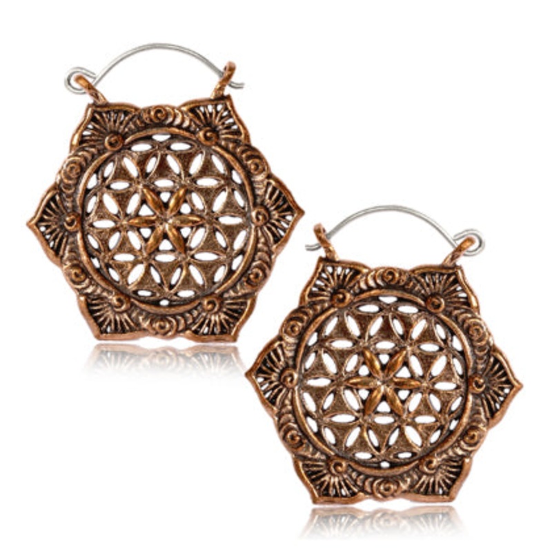 These20 gaugeflower of life earrings are cast from solid rose brass. The wearable wire is made from sterling silver.