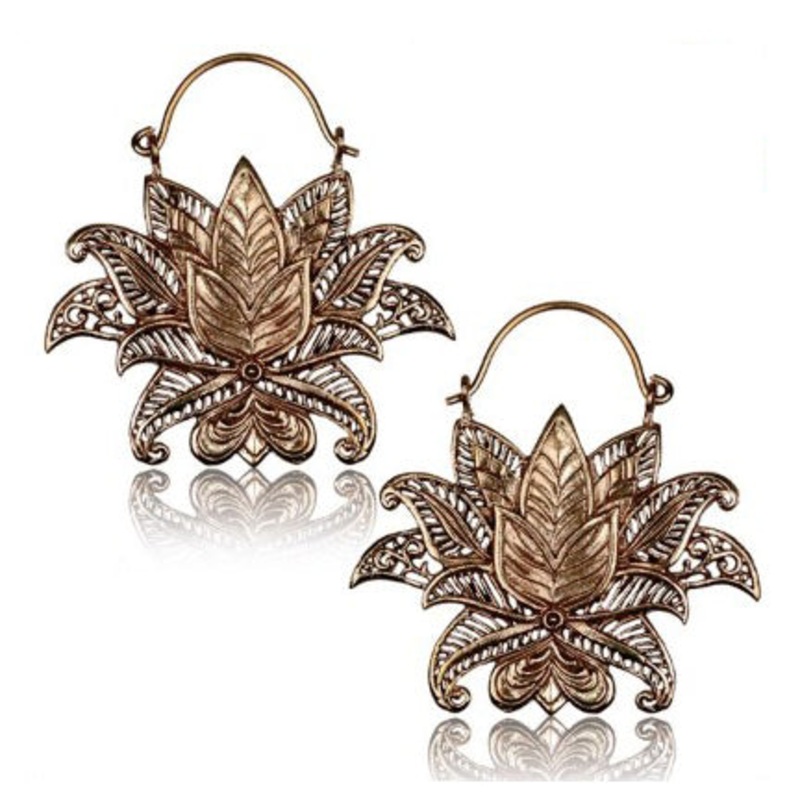 These 20 gauge lotusearrings are cast from solidrose brass and approximately 1-3/4″ tall x 1-3/4″ wide.