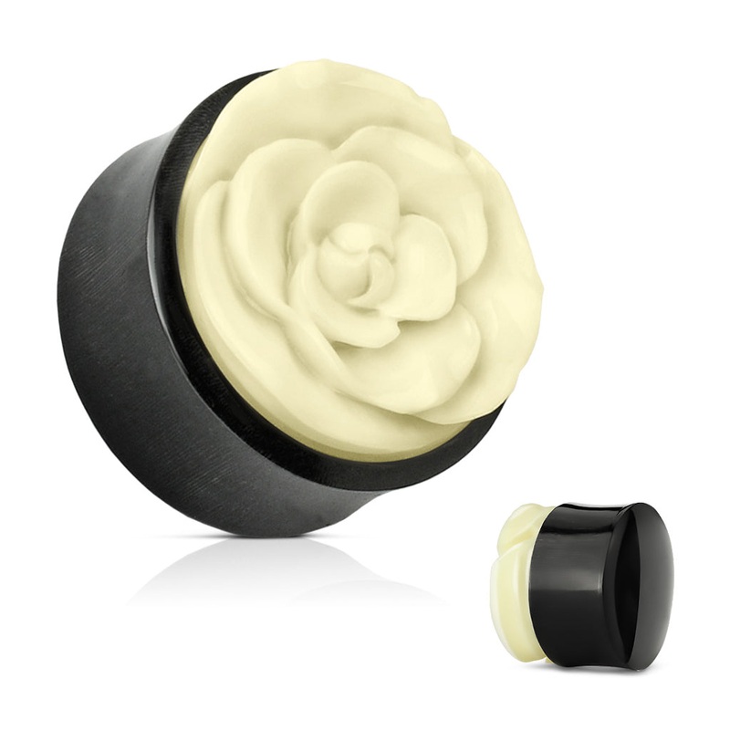 These double flarerose plugs are made from handcarved water buffalo horn with bone inlay. Choose your size below.