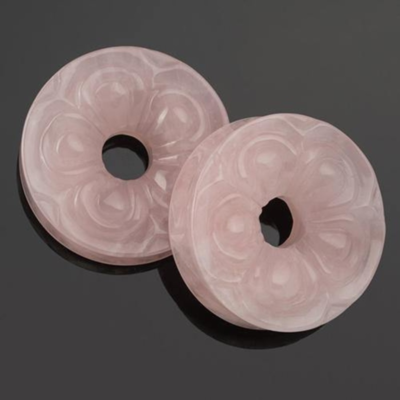 You’ll get a matched pair of rose quartz carved flower tunnels made by Diablo Organics. These are available in size 3/4″ only.