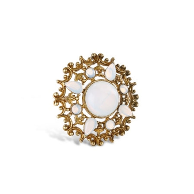 Designed to add glamour to any outfit this opulent antique gold platedbrooch from Newbridge Silverware is a staple accessory must have for any coat lapel or scarf this season. This spectacular piece with its opal coloured stone settings oozes luxury and is