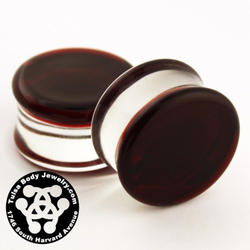 These double flare ruby color front plugs aremade from hand blown borosilicate glass by glasswear studios. They have a wearable area of approximately 3/8" between flares. Choose your size below.