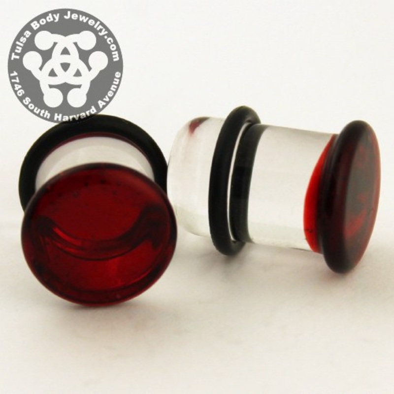 These single flare ruby color front plugs are made from hand blown borosilicate glass by glasswear studios. They have approximately 3/8" wearable area between the flare and o-ring. Two o-rings are included. Choose your size below.