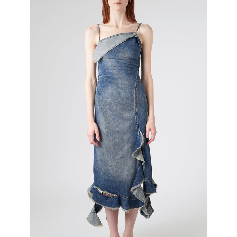 Acne Studios strap dress is crafted from a distressed non-stretch denim, adorned with ruffle details and front slit. Cut to a regular fit with a mid-length.