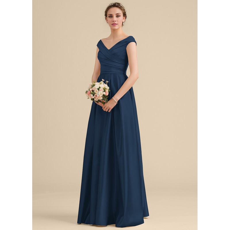 Ruffled A-Line Off-The-Shoulder Floor-Length Satin Bridesmaids Dress