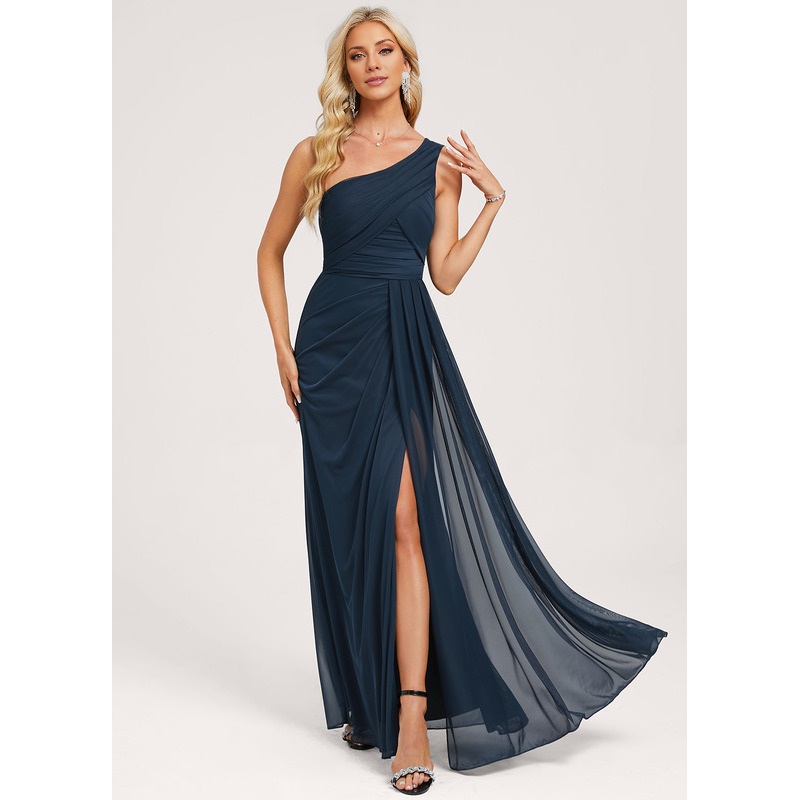Ruffled A-line One Shoulder Floor Length Mesh Bridesmaid Dress