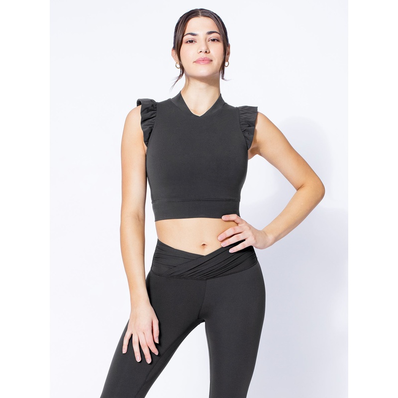 BAREWEAR+ Engineered by AUMNIE+ Nude Feel super soft lightweight fabric+ Enhanced stretch for contoured sleek fit with comfortDescriptionFull coverage V-neck collarSleeveless cropped top with ruffle trimsDesigned for yoga, Pilates, dance, fitness & daily a