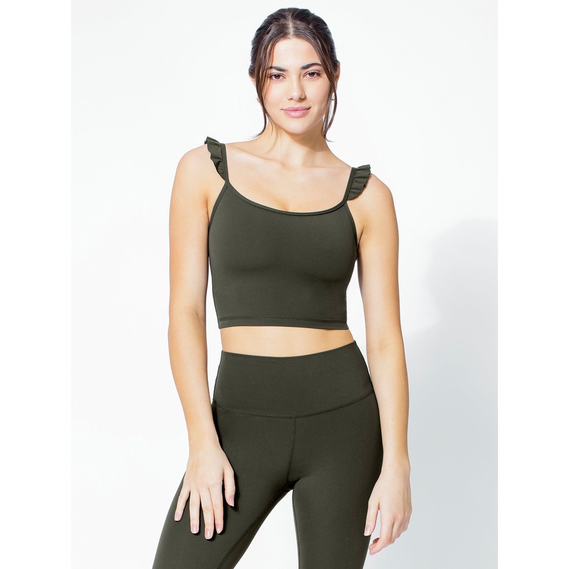 BAREWEAR+ Engineered by AUMNIE+ Nude Feel super soft lightweight fabric+ Enhanced stretch for contoured sleek fit with comfortDescriptionSleeveless cropped top with ruffle trims on shoulder strapsCropped length ideal for yoga and trainingDesigned for yoga,