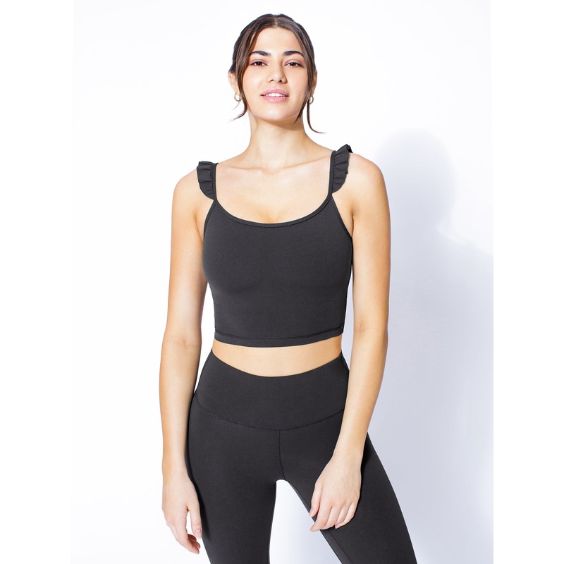 BAREWEAR+ Engineered by AUMNIE+ Nude Feel super soft lightweight fabric+ Enhanced stretch for contoured sleek fit with comfortDescriptionSleeveless cropped top with ruffle trims on shoulder strapsCropped length ideal for yoga and trainingDesigned for yoga,