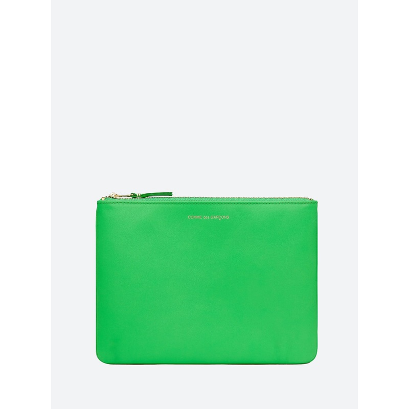 Green leather pouch wallet or clutch with single gold-tone zip. This is a great option for when a size between a bag and a wallet is needed. Carry as a clutch or small portfolio.Main zip compartmentChevron leather tabDimensions:215 x 160 mmMaterialsFabric