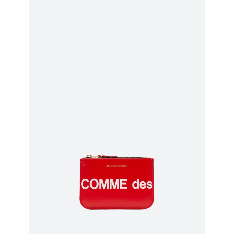 Comme des Garons SA8100 classic wallet branded with a huge logo across the front and back. A zip closure keeps your cards, coins and cash safe and secure.