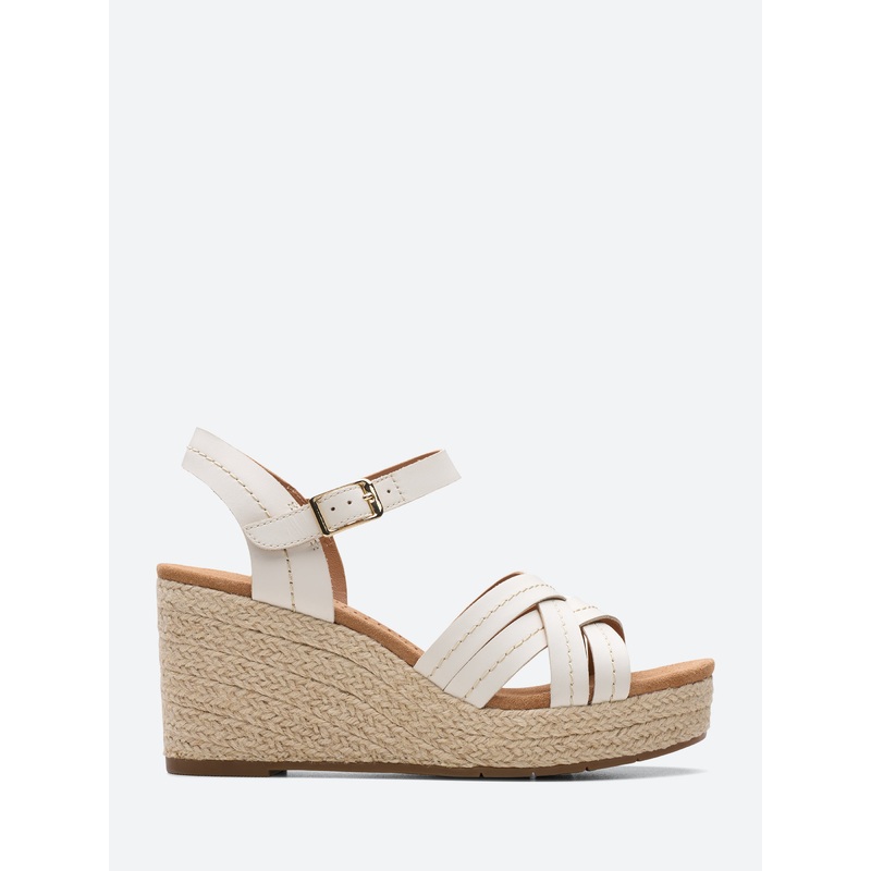 Crafted with a sleek cross-over leather upper in a timeless hue, its complete with Clarks' signature Contour Cushion footbed to offer unrivaled comfort while a flexible sole and jute-wrapped wedge keep steps looking good and feeling even better.Adjustable