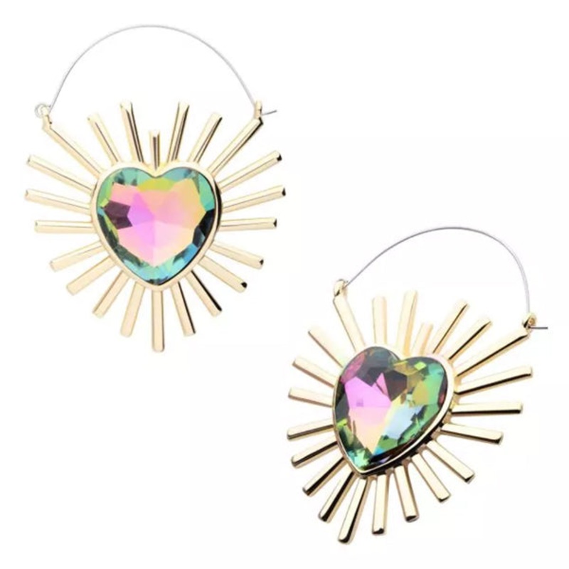 These 20 gauge sacred heart hoop earrings have a bright gold finish. The hinged post is made from 316L surgical steel. They can be worn as regular earrings, but the oversize design is intended to fit comfortably inside most flesh tunnels. Sold as a pair.