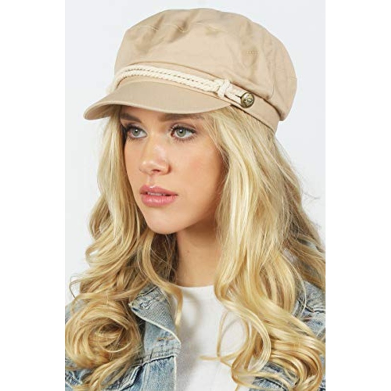 This stylish cap features a soft, shallow crown with a banded base and short curved brim(2 inches). It is finished with a rope band or beautiful stone detailing at the base and shiny metal button accents.