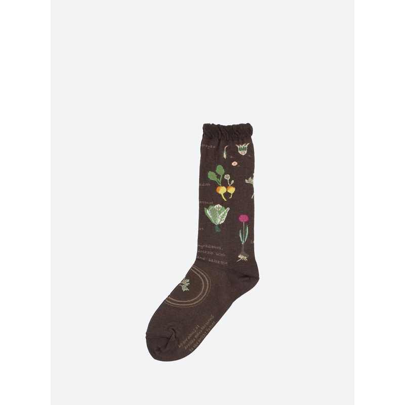Antipast crew length socks knitted in a fine gauge blend with some salad ingredients and salad making instruction written just above the foot.Crew length socksJacquard patternRuffled cuffTonal heel and toeMaterialsFabric Content: 50% cotton, 30% nylon, 20%