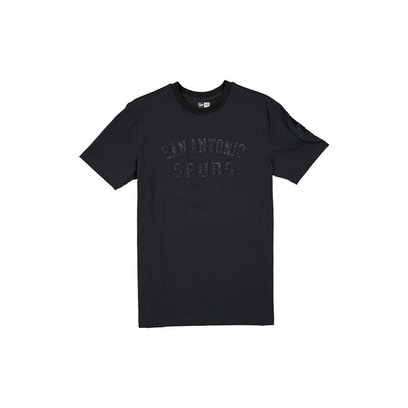The San Antonio Spurs Black on Black Logo Select T-Shirt features a satin applique with a tonal stitch Spurs wordmark at the chest and an embroidered team logo at the left-wear sleeve.