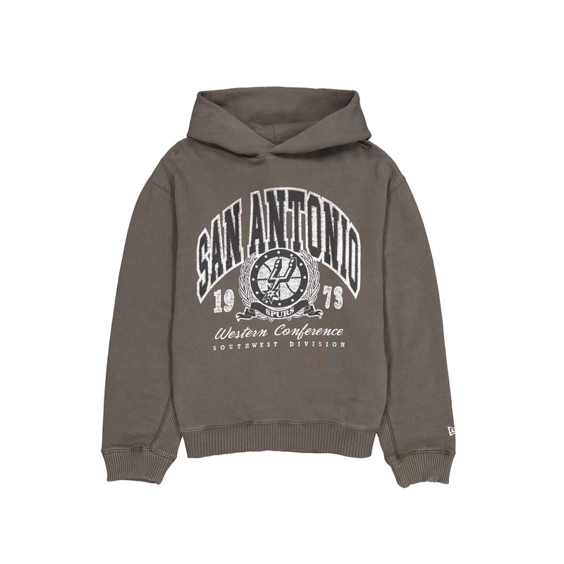 The San Antonio Spurs Oversized Essentials Hoodie features a distressed screen-printed Spurs graphic at the front.