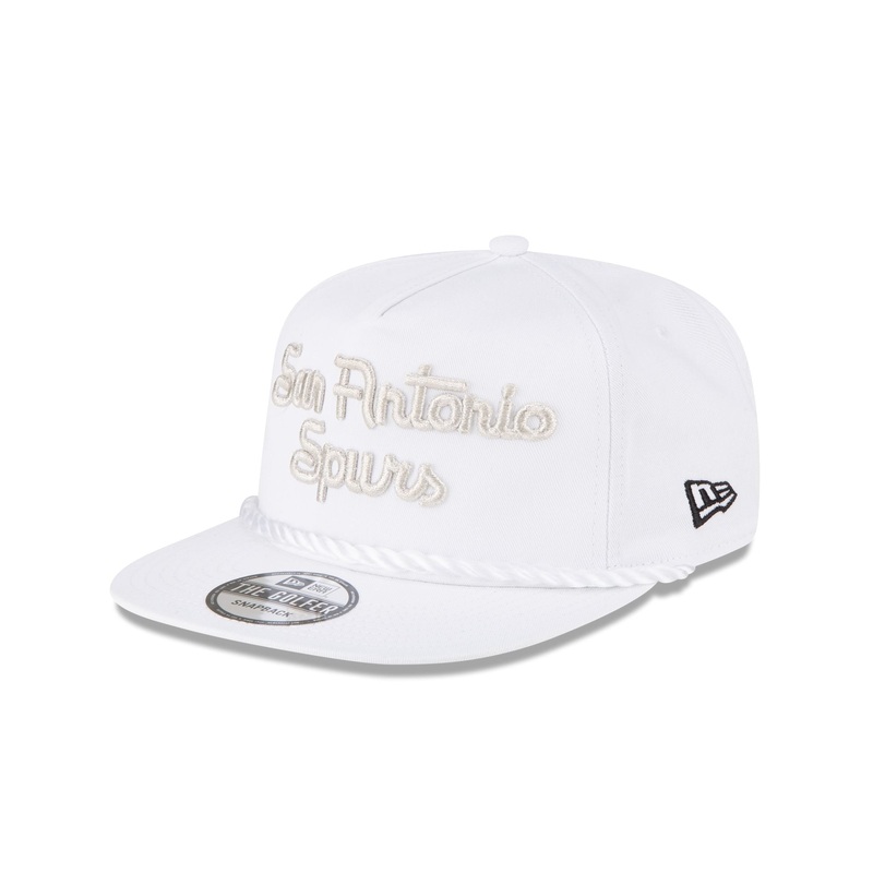 The San Antonio Spurs Script Golfer Snapback features an embroidered Spurs script at the front panels with a team logo above a snapback closure at the rear and a green undervisor.