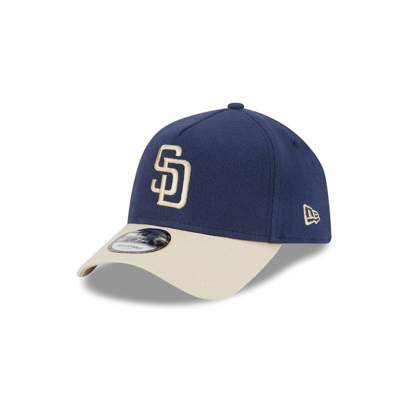 The San Diego Padres Moleskin Crown Navy 9FORTY A-Frame Snapback features an embroidered Padres logo at the front panels with an adjustable snapback closure at the rear and a tan undervisor.