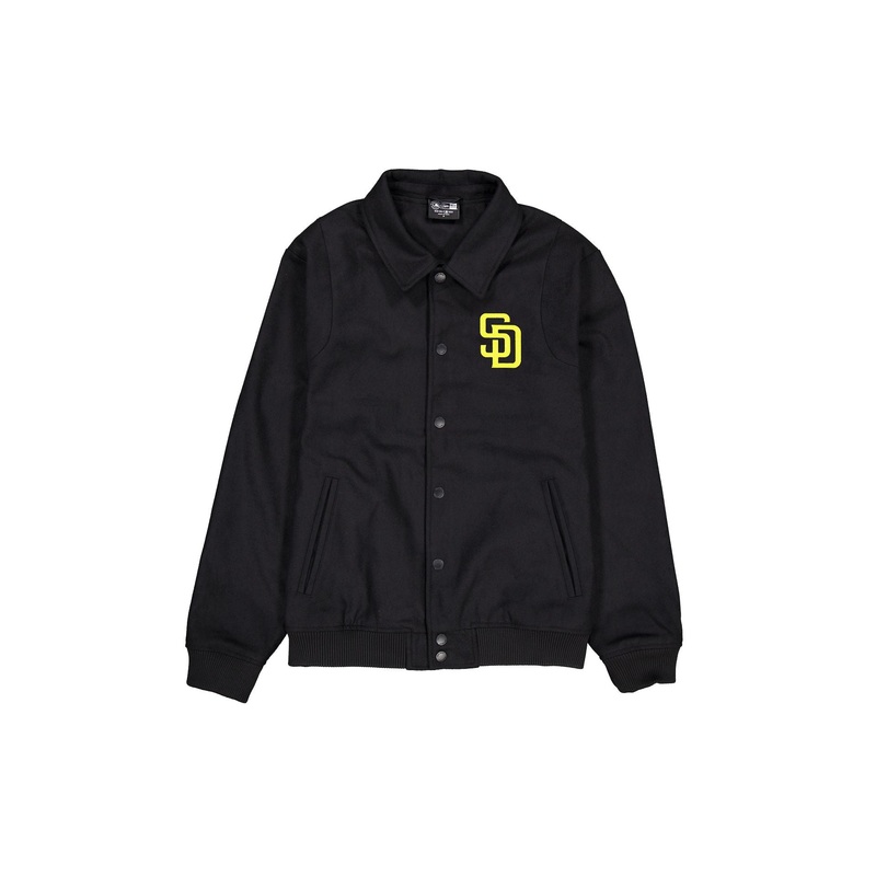 The San Diego Padres Sport Night Jacket features an embroidered Padres logo at the left chest with a snap button closure and a twill applique team wordmark at the rear.