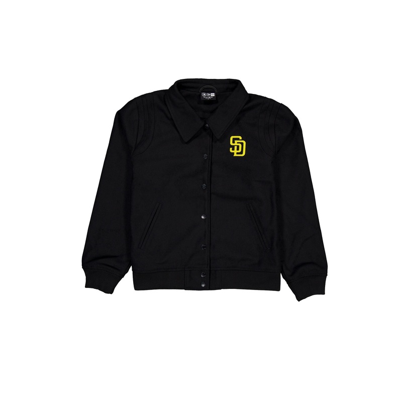 The San Diego Padres Sport Night Women’s Jacket features an embroidered Padres logo at the left chest with a snap button closure and a twill applique team wordmark at the rear.