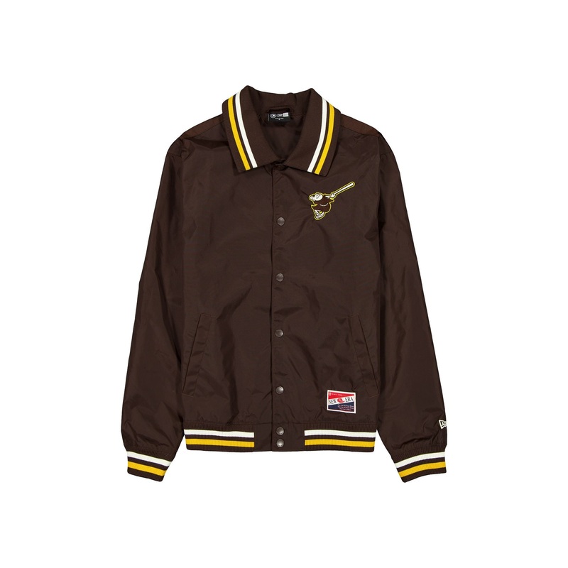 The San Diego Padres Throwback Jacket features an embroidered Padres logo at the left chest with a logo and wordmark at the rear. Additional details include pockets, a button closure, and a New Era jock tag at the left hip.