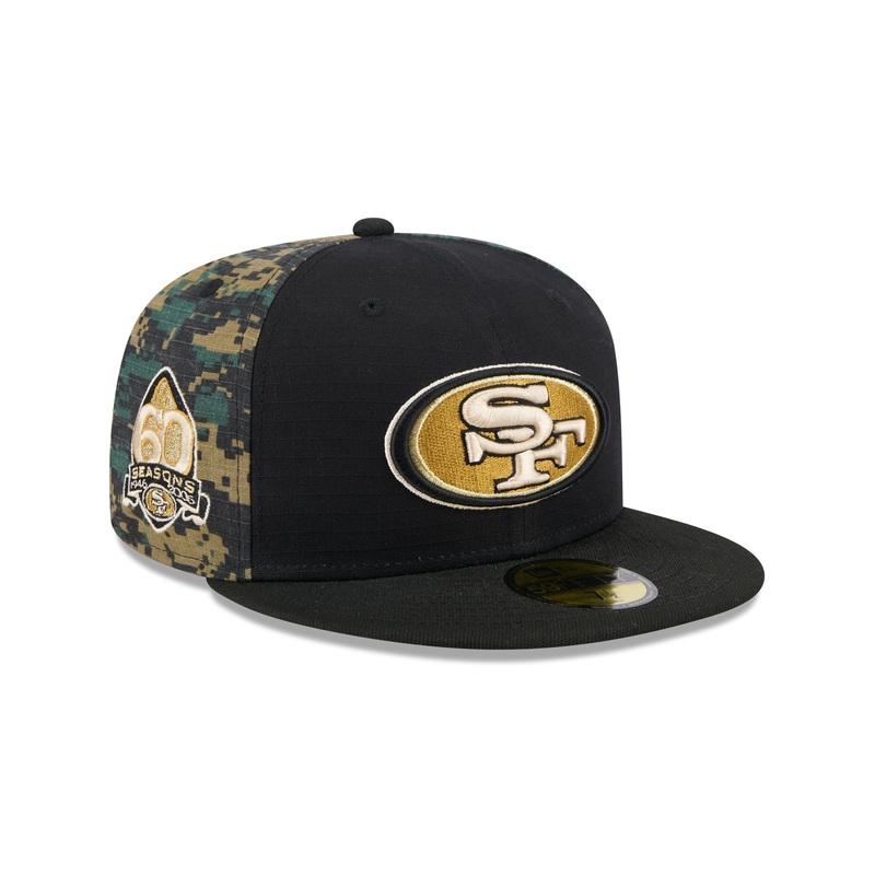 The San Francisco 49ers Digi Camo 59FIFTY Fitted Cap features an embroidered 49ers logo at the front panels with a matching NFL Shield at the rear. Additional details include a digi camo rear, a 60th Season patch at the right-wear side, and a gray undervis