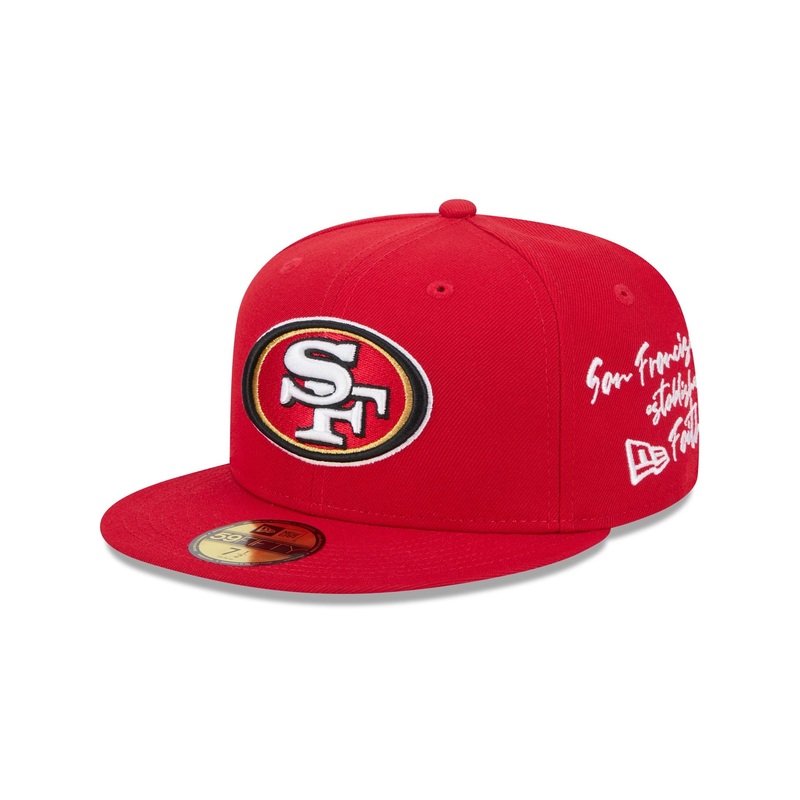The San Francisco 49ers Team Verbiage 59FIFTY Fitted Cap features an embroidered 49ers logo at the front panels with a matching NFL Shield at the rear, a city inspired script at the left-wear side, and a gray undervisor.