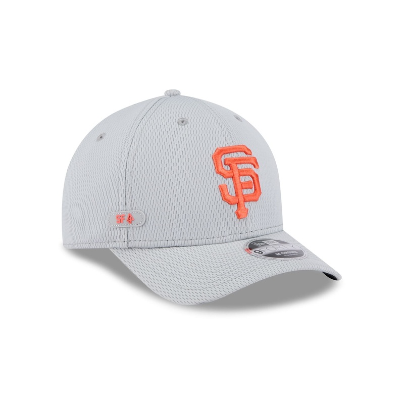 The San Francisco Giants 2025 Clubhouse Gray 9FORTY M-Crown Snapback features an embroidered Giants logo at the front panels with a matching MLB Batterman logo above a snapback closure at the rear and a dashmark mesh fabrication throughout. Additional deta