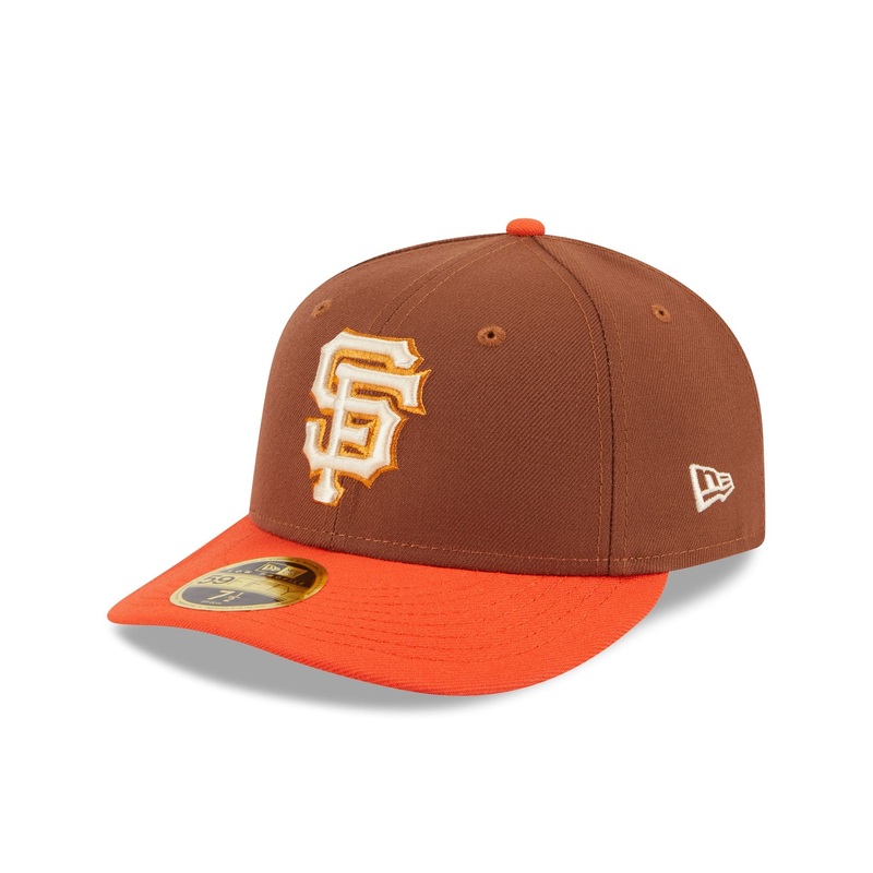 The San Francisco Giants Tiramisu Low Profile 59FIFTY Fitted Cap features an embroidered Giants logo at the front panels with a matching MLB Batterman logo at the rear and a gray undervisor.