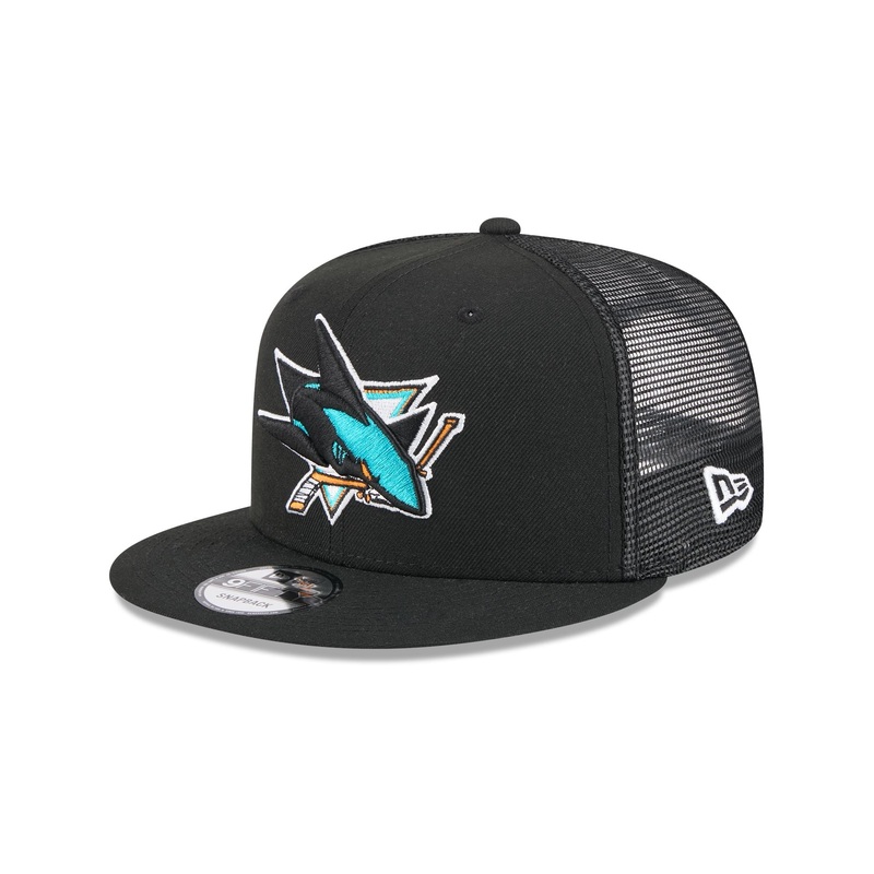 The San Jose Sharks Team Tag 9FIFTY Trucker features an embroidered Sharks logo at the front panels with a team tag on an snapback closure at a mesh rear and a gray undervisor.