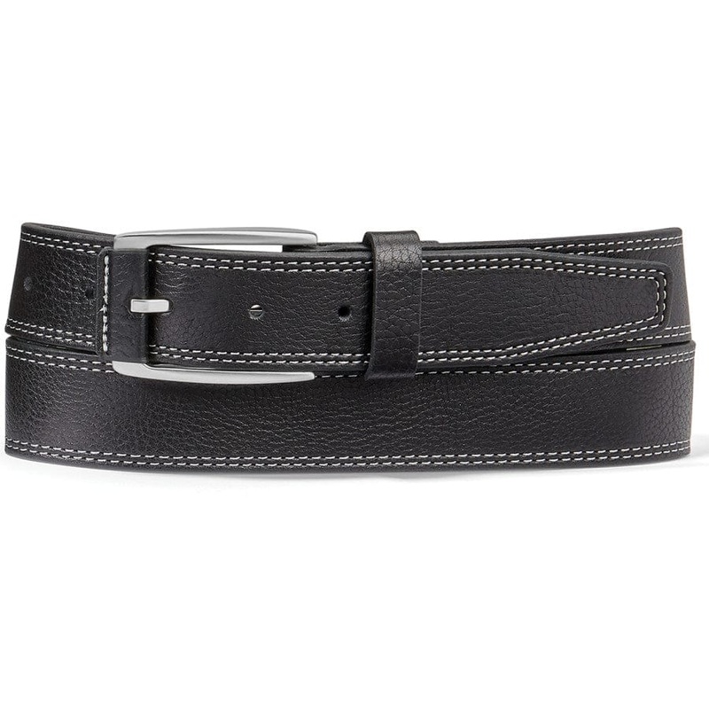 Our craftsmen stitch our leather belts meticulously, using many more stitches than other belt manufacturers use, because we want your belt to last. The leather accent on this buckle adds another artisan touch.