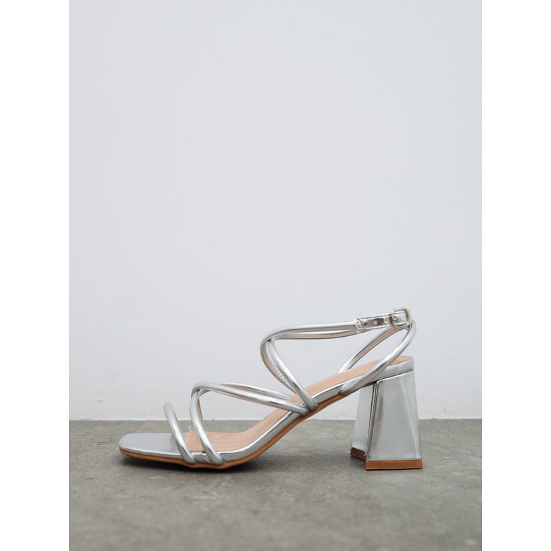 Zapato de tacn bajosin plataforma de color plata con tiras entrelazadas atado al tobillo con hebilla plateada.