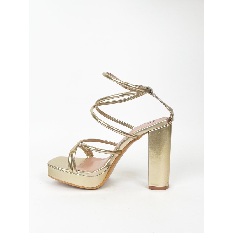 Zapato de tacn alto de color dorado con tiras entrelazadas atado al tobillo con hebilla dorada.Altura tacn: 11,5 cm y 3,5 cm de plataforma Talla desde 35 a 41.Material: Piel veganaEste articulo esta diseado y fabricado integramente en Europa e importado po