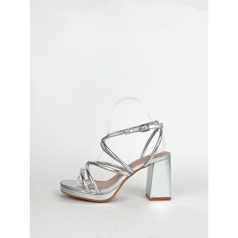 Zapato de tacn alto de color dorado con tiras entrelazadas atado al tobillo con hebilla plateada.Altura tacn: 8,5 cm y 1,5 de plataformaTalla desde 35 a 41.Material: Piel veganaEste articulo esta diseado y fabricado ntegramente en Europa e importado por So