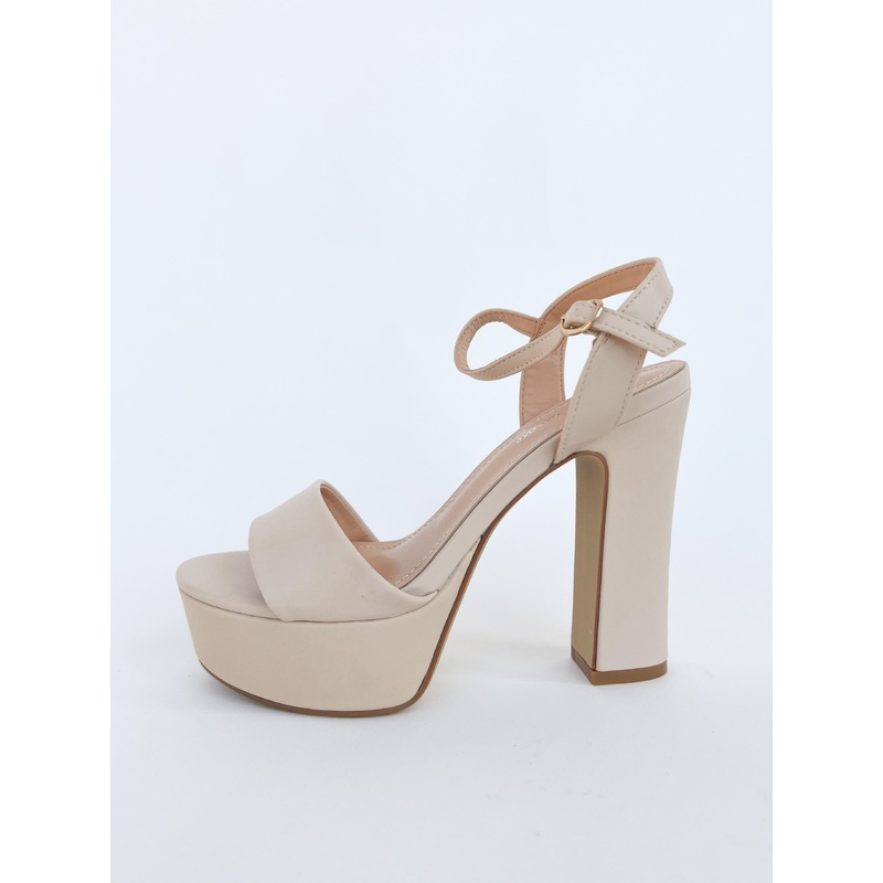 Zapato plataforma de color nude atado al tobillo con hebilla dorada.