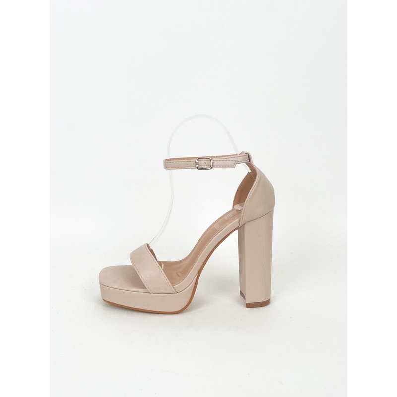 Zapato de tacn medio con plataforma de color nude. Banda delantera, atado al tobillo con hebilla plateada.