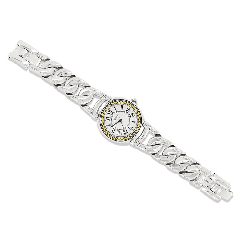 On this chain style watch band, the links are designed pieces not simply links from a chain. The links taper in size. The casing has a bezel of brushed gold roping which ties back to the roped Monete collection. watches feature a Japanese movement, which is the worlds finest.