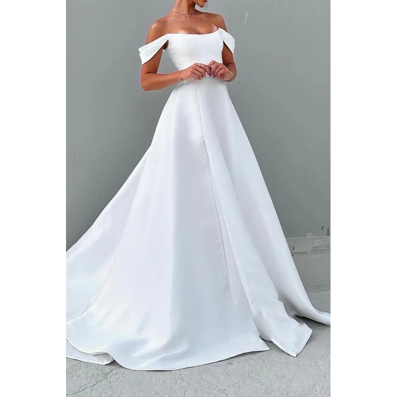 Satin A-line boat shaped off shoulder train elegant wedding dress