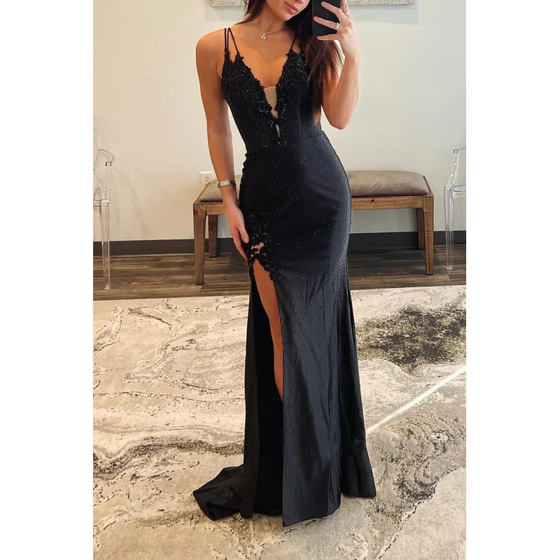 Satin fit V-neck slim shoulder strap with applique side slit for evening dress